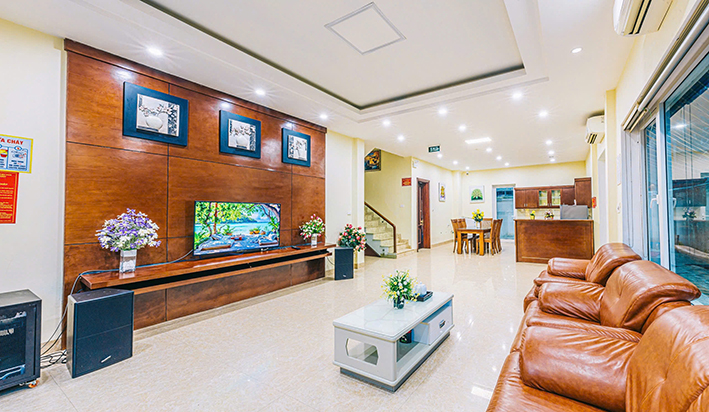 👉 Phòng khách nằm ở tầng 1. Thiết kế mở liên thông với bếp tạo cảm giác rộng rãi và kết nối. Nội thất hiện đại với bàn ghế lớn, TV màn hình rộng, hệ thống karaoke xịn sẵn sàng cho mọi buổi tụ họp hay chill ban đêm.